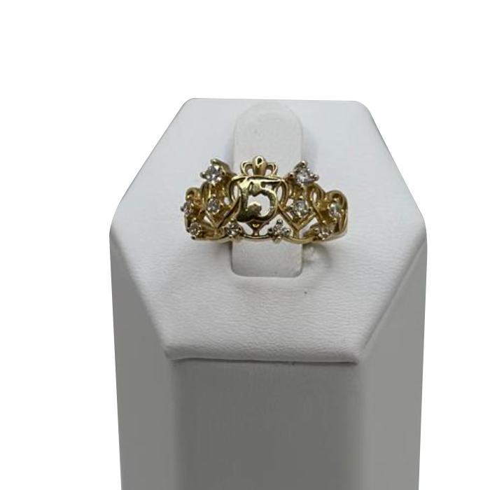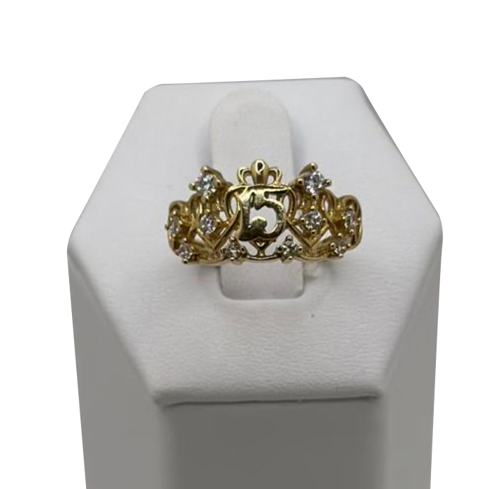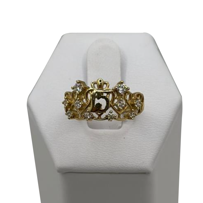 "This elegant 10K solid gold yellow crown ring is designed to celebrate a special 15 Años (Quinceañera) milestone. Adorned with sparkling CZ stones in a regal crown design, this ring exudes sophistication and charm. The solid gold construction ensures lasting quality, while the radiant CZ accents add a touch of glamour. Perfect for commemorating this significant occasion, this ring is both a beautiful and meaningful keepsake."